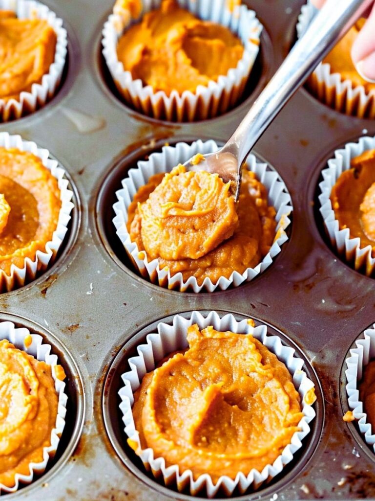 - Fill each liner halfway with pumpkin batter, add a spoonful of cream cheese filling, then top with more batter until ¾ full.